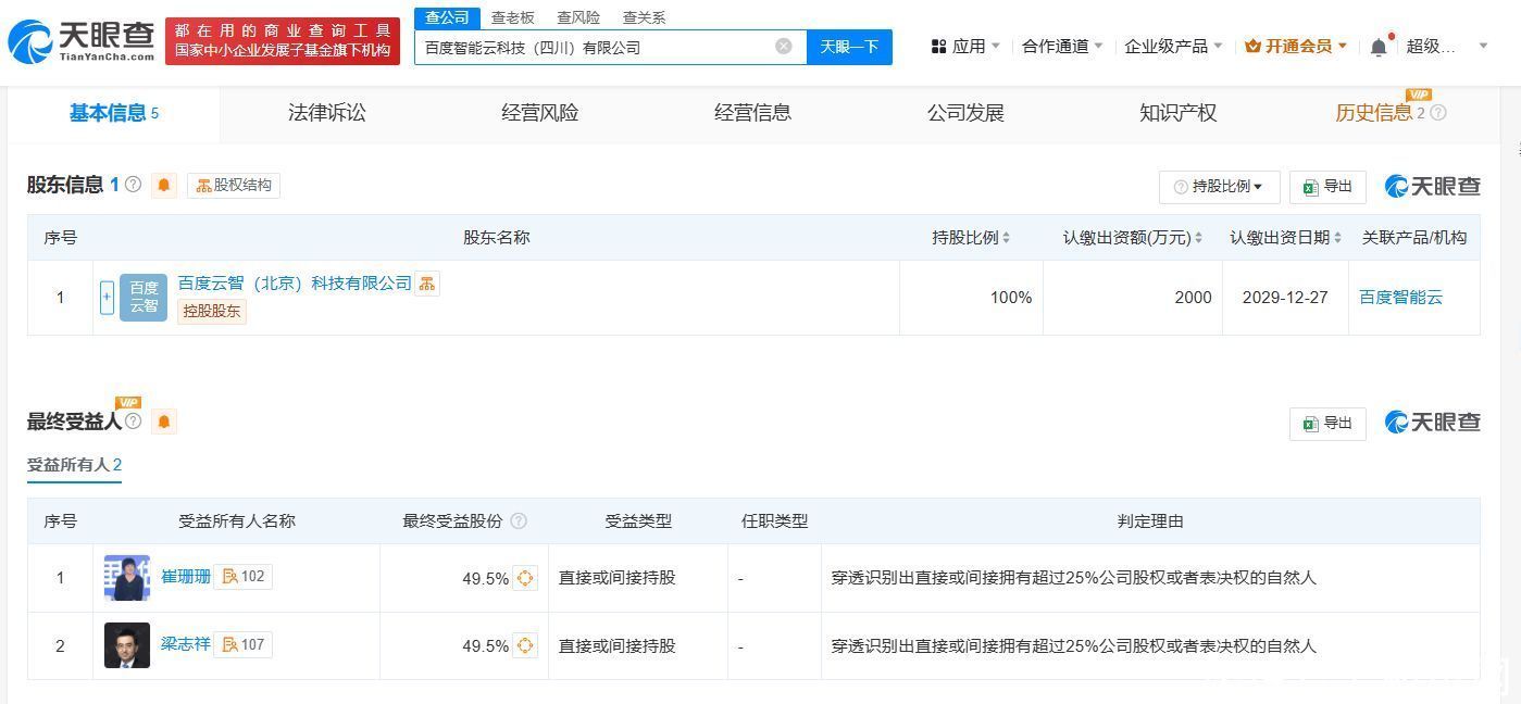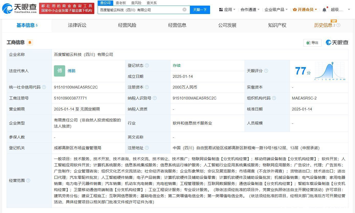 天眼查App显示,近日,百度智能云科技(四川)有限公司成立,法定代表人为傅鹏,注册资本2000万人民币,经营范围包括软件开发、人工智能应用软件开发、人工智能行业应用系统集成服务、物联网应用服务等。股东信息显示,该公司由百度云智(北京)科技有限公司全资持股。最终受益人信息显示,该公司受益所有人为崔珊珊、梁志祥。